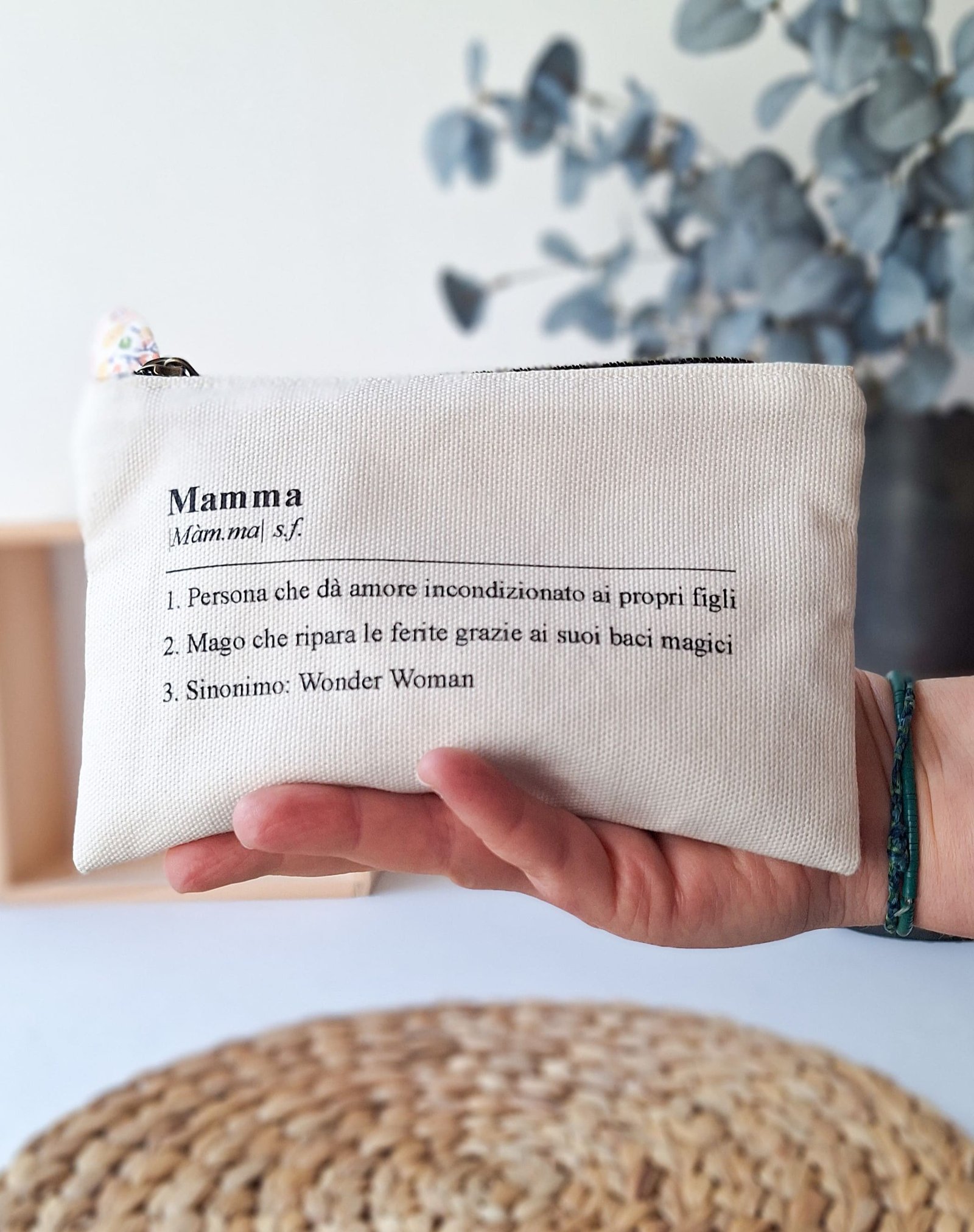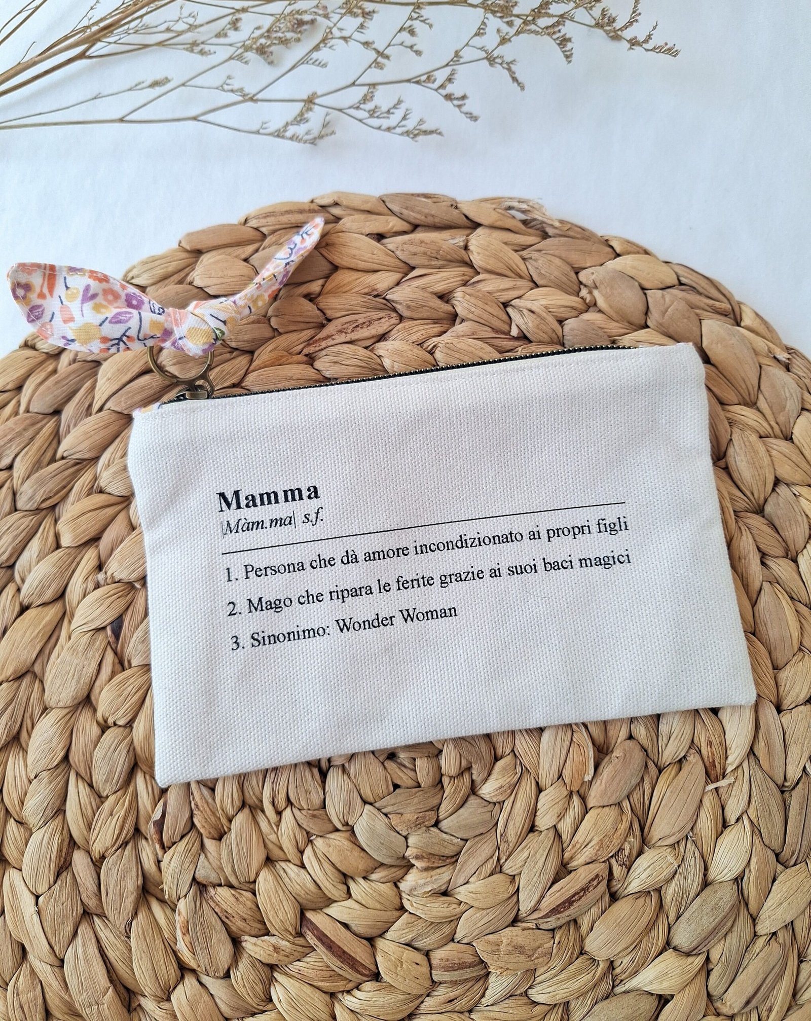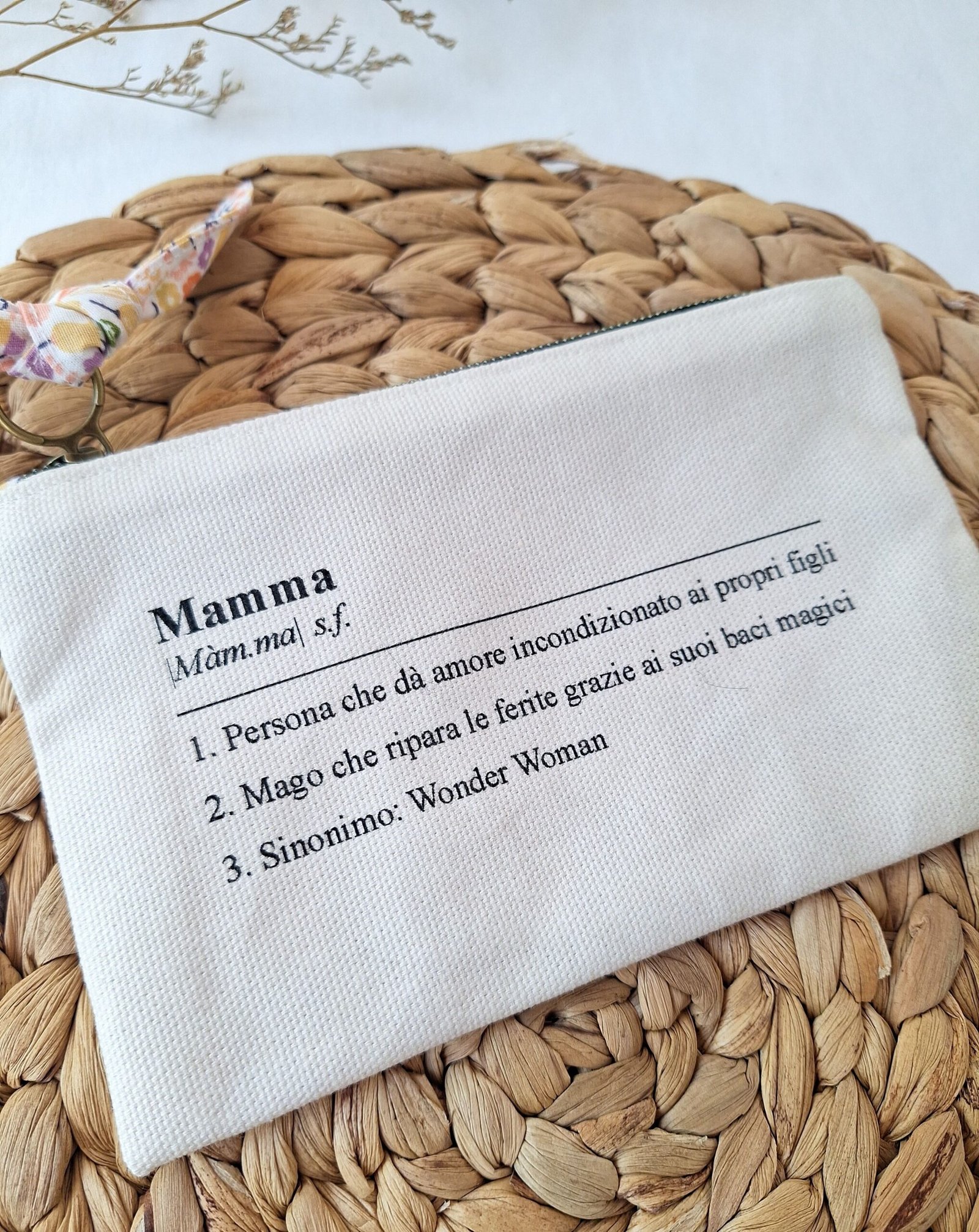 Una pochette in panama di cotone con la definizione di mamma più vera che esista.
